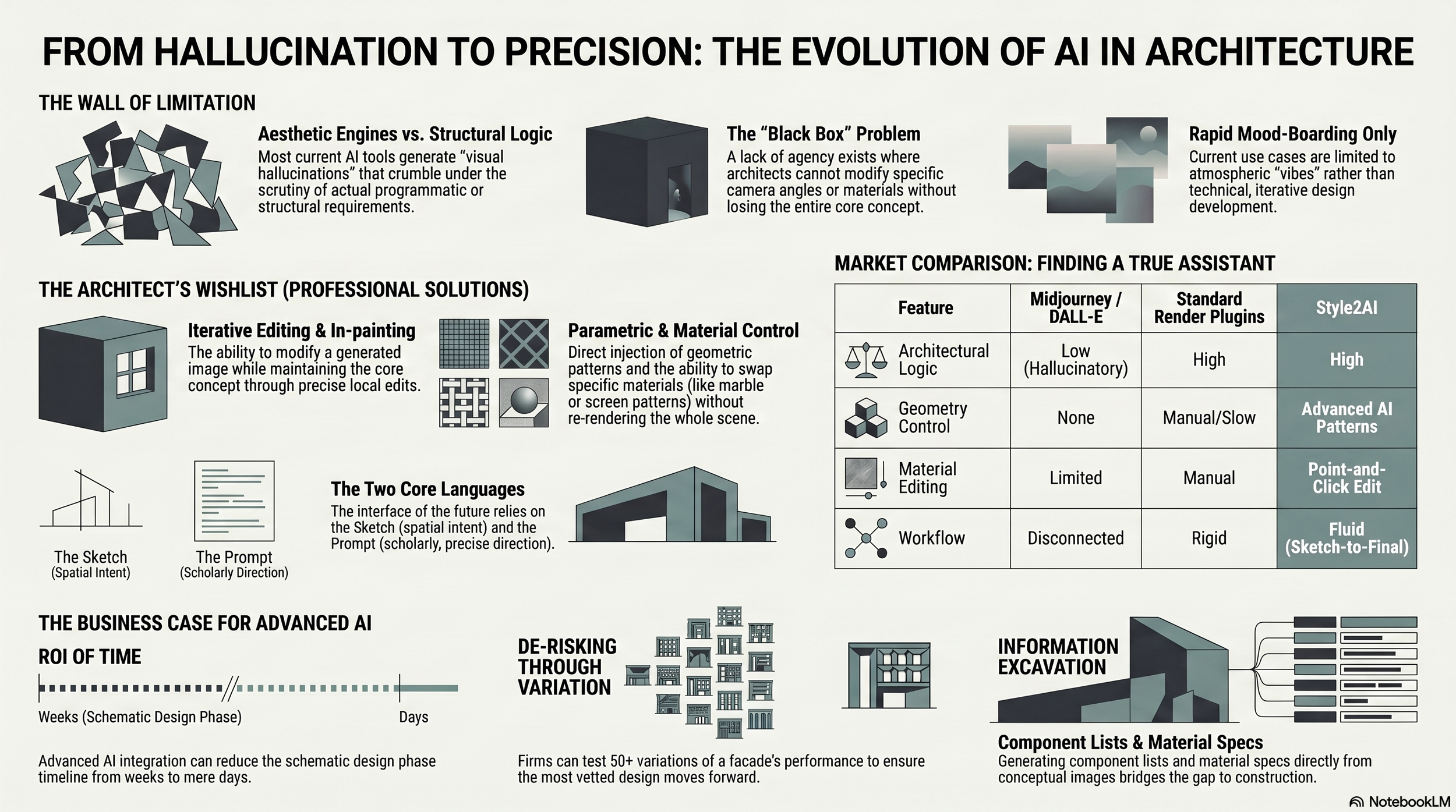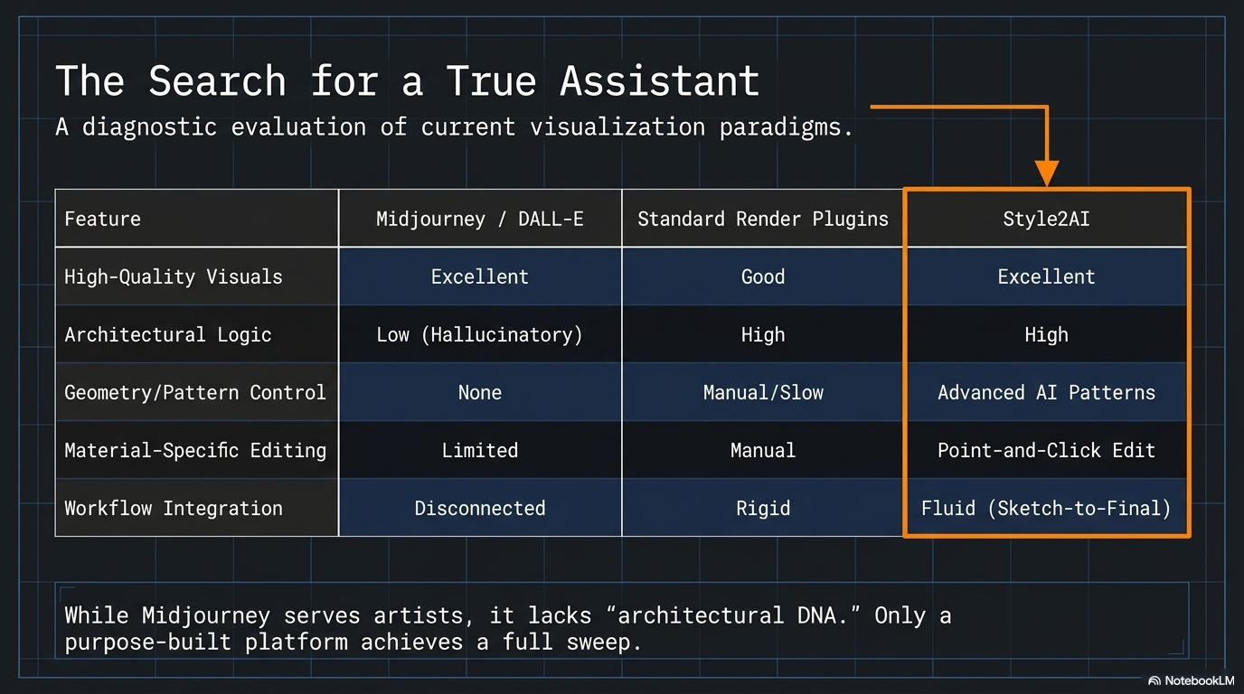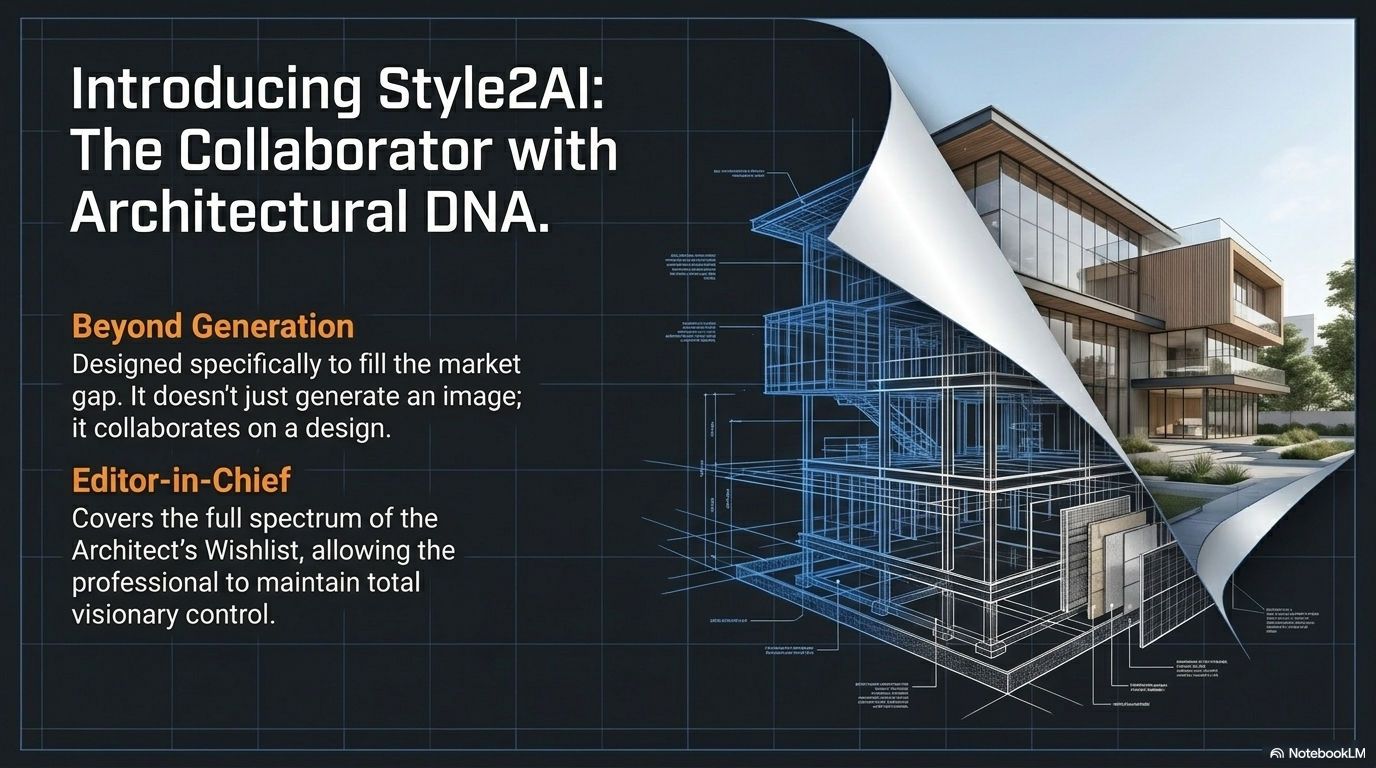 While tools like Midjourney are fantastic for artists, they lack the "architectural DNA" required for professional practice. Style2AI was designed specifically to fill the gaps identified above. It doesn't just generate; it collaborates.