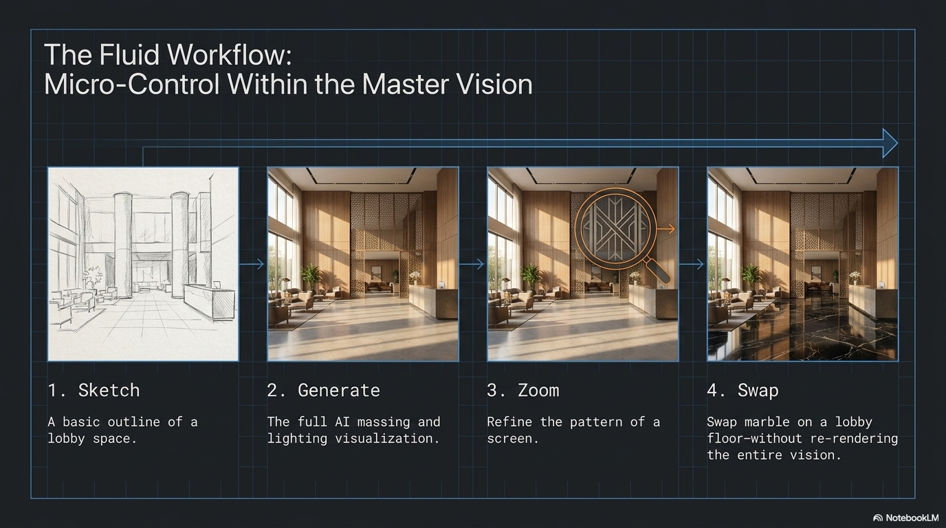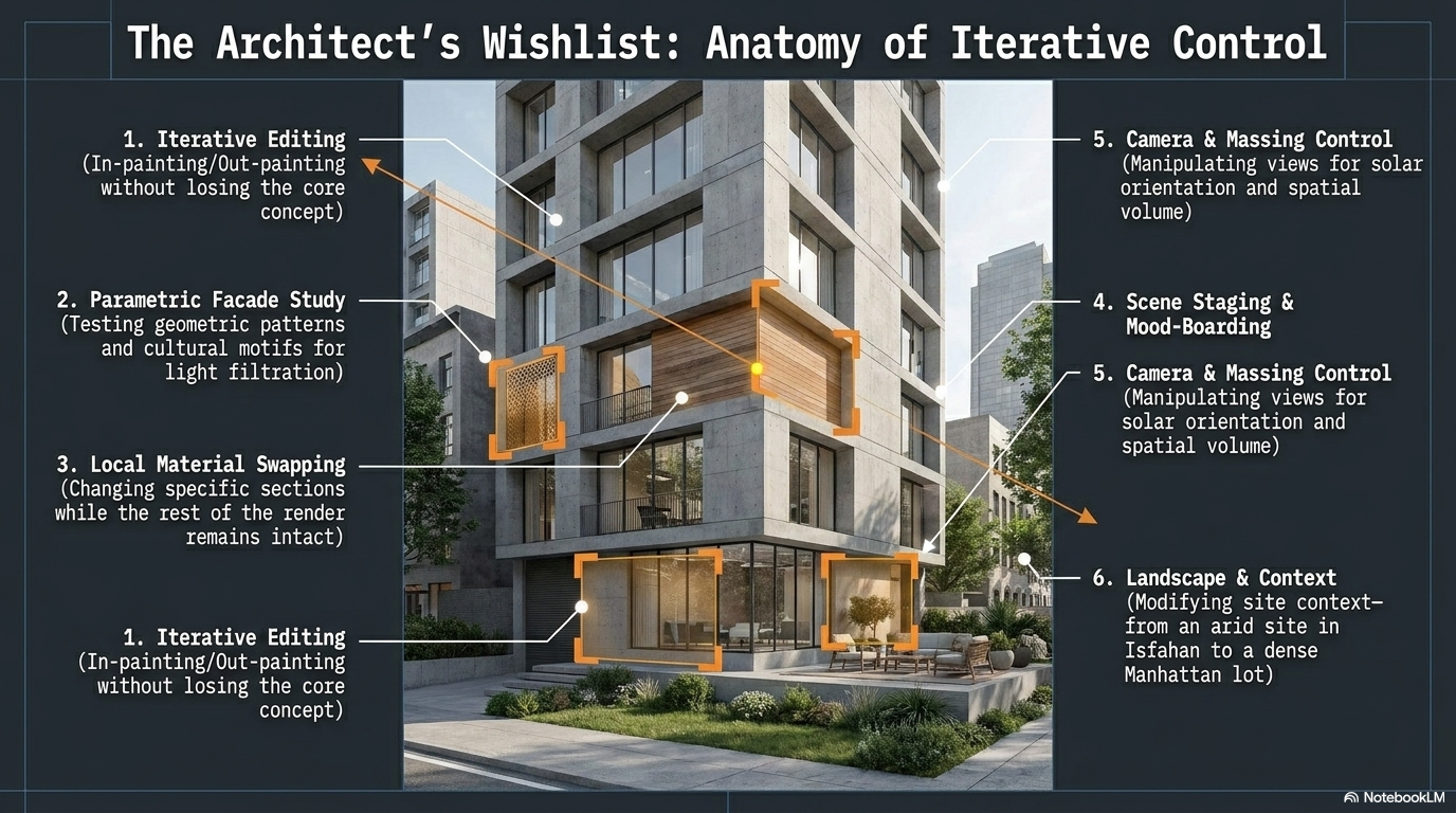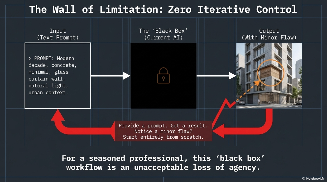 The Limitation: The "wall" most architects hit is the lack of control. These tools are essentially "black boxes." You provide a prompt, and it gives you a result. If the camera angle is slightly off, or if you love the facade but hate the material on the third floor, you often have to start from scratch. For a seasoned professional, this is an unacceptable loss of agency.