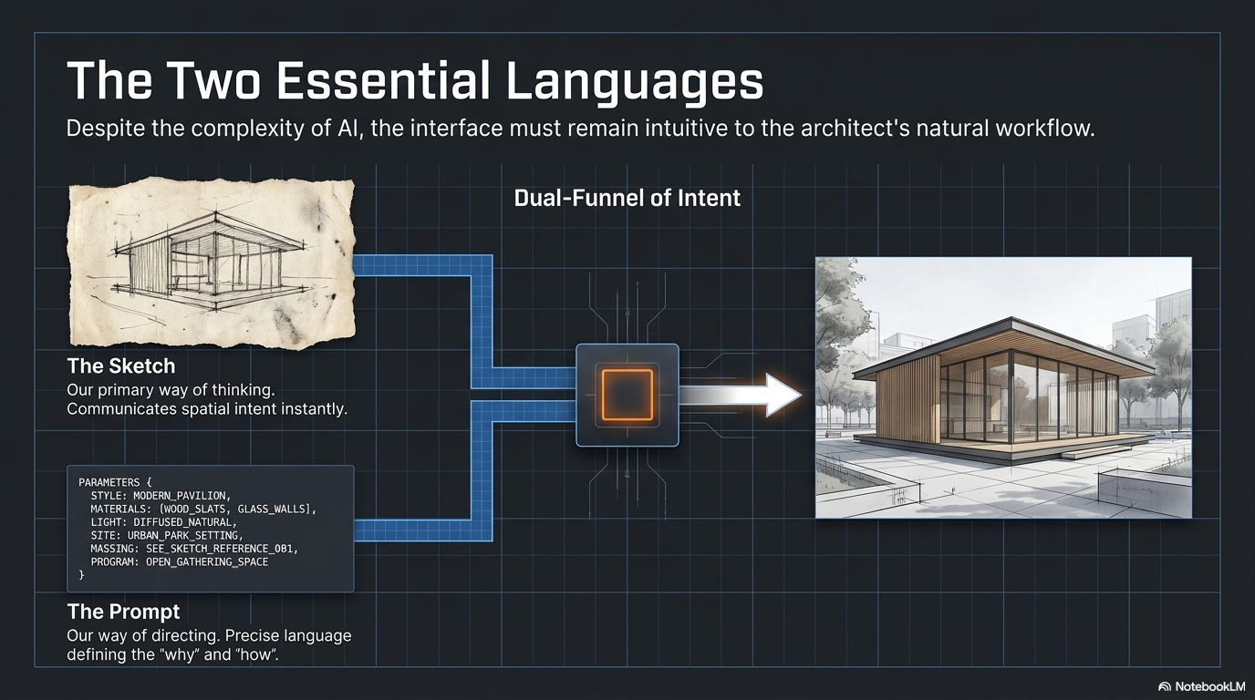 Despite the complexity of these features, the interface must remain intuitive. The only two languages an architect truly needs to master for AI are The Prompt (Text) and The Sketch. * The Sketch: Our primary way of thinking. An AI should take a rough hand-drawn massing and understand its spatial intent.